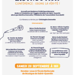 Samedi 20 septembre à 18 heures École de musique De Saint-Quentin (02) L’Association Socrate 02 et le GRIP vous donnent rendez-vous à Saint-Quentin pour éclairer certains aspects de la vérité scolaire en France pour cette rentrée 2025. Martine Donnette vous présentera le projet proposé par l’Association Socrate 02 pour la réussite des élèves dans une […]